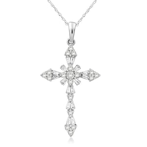 Exceptional Design: This cross pendant is a testament to exceptional craftsmanship, featuring a brilliant design adorned with 1/2 CTTW Natural White Round and Baguette Diamonds. Its elegant 10K white and yellow gold construction adds a touch of sophistication to the piece.