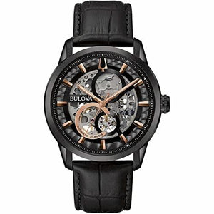 The black stainless steel screw-back case has a “skeletonized” black three-hand dial with rose-gold-tone hands and markers and grey accents, revealing the intricate workings of the self-winding 21-jewel automatic movement. It is paired with a rich black alligator grain leather watch strap, finished with a push-button deployant buckle. The entire watch is also water resistant up to 30 meters. This distinctive automatic watch is an excellent addition to any collection.