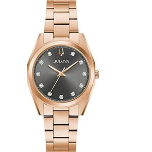 The classic Surveyor line from Bulova has been updated with a Dress Sport ladies watch. This rose-gold watch has a stainless steel case and bracelet with an elegant flair. The sunray grey dial is hand set with 11 diamonds for both the look and feel of a luxury watch. This quality timepiece is well-made and beautifully detailed, making it an elegant addition to any collection. Color: Rose Gold.