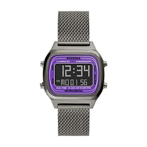 This 40mm Retro Digital Fossil watch features a negative display dial, digital movement and smoke stainless steel bracelet.