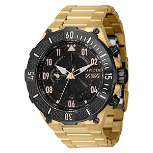 The Invicta Men's Aviator 50mm Stainless Steel Quartz Watch, Model 39907, isn't just a timepiece—it's a salute to aviation's legacy and a symbol of your journey, whether on a short trip or a lifelong adventure. With a 50mm gold case and intricate design, this watch is your ultimate instrument, ready for takeoff.