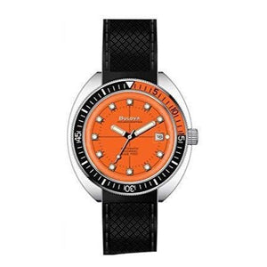 41mm stainless steel case Black and orange rotating bezel ISO certified Screw-down crown Double curved sapphire box crystal 821D Miyota 3 hand automatic movement Black rubber strap Orange dial with date window at 3 o'clock and luminous accents Water resistance up to 200 meters Bulova Style #: 96B350.