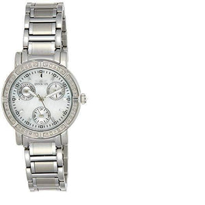 Elegantly topped by a bezel ringed with 16 hand set sparkling diamonds. The diamonds are GH color and SI clarity. The shimmery mother-of-pearl dial face includes three silver sub-dials with measurements for 1/10th of a second, 60 seconds, and 30 minutes of elapsed time as well as luminous Tritnite hands and hour markers, small minute indexes, and a date window at 4 o'clock. The round watch case measures 33mm wide (1.30 inches) and 11mm thick (0.43 inches). It's complemented by a stainless steel bracelet band that mixes polished and satin links. Other features include a precise Swiss quartz movement, a scratch-resistant sapphire crystal, and water resistance to 100 meters (330 feet)--offering protection from accidental splashes as well suitable for swimming, snorkeling, and light recreational diving.