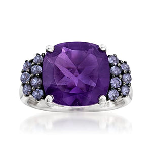 Embrace the regal charm of the Ross-Simons 5.50 Carat Amethyst and 0.40 Carat Tanzanite Ring in Sterling Silver. This stunning ring combines the allure of a 5.50 carat cushion-cut amethyst with the sparkle of tanzanite rounds totaling 0.40 carats, all set in polished sterling silver with black rhodium accents.