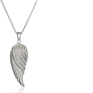 The 1.56-inch wing-shaped pendant features glossy sterling silver "feathers" and five rows of small diamonds. Sure to be a hit with your girlfriends, the Angel Wings necklace makes a fun yet elegant accessory. Whether or not you act like an angel is entirely up to you. The necklace closes with a spring-ring clasp and comes protected by a regal blue sueded-cloth pouch that's ideal for storing and gift-giving.