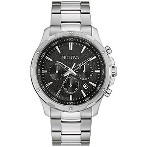 - Bulova Classic Chronograph Mens Watch features a stainless steel case and bracelet and black dial with calendar window, and flat mineral crystal.