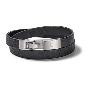 Supple double-wrap smooth black leather bracelet with brushed stainless steel hook clasp accented by the signature Bulova tuning fork logo.