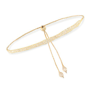 - ITALIAN CZ AND 14KT YELLOW GOLD — 3.00 ct. t.w. CZ mesh bolo bracelet in 14kt yellow gold. Round faceted beads and round brilliant-cut CZs. Polished finish. 1/8 in. wide. 1mm mesh chain. Adjusts to fit most wrists.