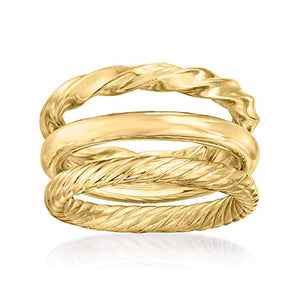This nicely priced set features three rings in polished 18kt yellow gold over sterling silver: a plain polished band, a ribbed band and a twisted band. 3/8" wide when all worn together. 18kt yellow gold over sterling silver ring set. Each Ross-Simons item arrives in a fine jewelry presentation box. Shop Ross-Simons jewelry risk-free as all items include a 30-day, 100% money-back guarantee.