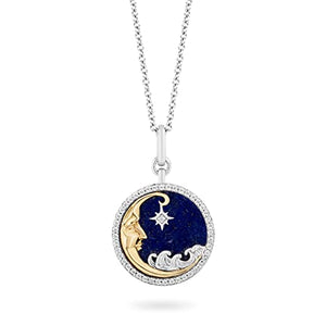 Embark on a celestial journey with the Jewelili Hallmark Dreamer's Moon Medallion Pendant Necklace—an officially licensed Hallmark Jewelry piece. Crafted in sterling silver and 14K yellow gold, adorned with a 16mm round shape lapis and 1/4 cttw natural white round diamonds, this pendant is a manifestation of dreams and elegance.