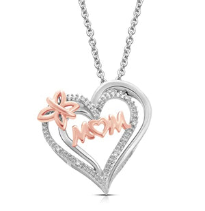 Embrace the enchanting allure of the Jewelili Rose Gold Over Sterling Silver Natural White Round Diamond Tilted Mom and Butterfly Heart Pendant Necklace. This masterpiece of craftsmanship marries the elegance of rose gold with the brilliance of natural white round diamonds, encapsulating your emotions in a captivating pendant that promises to make every moment memorable.