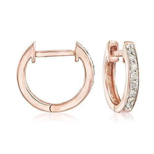 - DIAMONDS AND 14KT ROSE GOLD — .10 ct. t.w. diamond huggie hoop earrings in 14kt rose gold. Round diamonds. Polished finish. 3/8 in. hanging length, 1/16 in. wide. Hinged post backings.