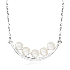 A simple silver necklace made more alluring with added shimmer. Five 5.5-6mm cultured freshwater button pearls sit in a chic row along a sleek sterling curve. An easy, elegant touch when a full strand is too much. A sleek elegant layer, five cultured freshwater pearls align along a sleek sterling silver curve. This clean, minimalist design is perfect for an everyday look and will add a fresh and modern elegance to any women’s jewelry collection. Set in polished sterling silver. Cable chain. Springring clasp, white pearl curved bar necklace. Necklace drop length - 3/8 inch long. Necklace drop width - 1 1/2 inches wide. Each Ross-Simons item arrives in a fine jewelry presentation box. Shop Ross-Simons jewelry risk-free as all items include a 30-day, 100% money-back guarantee. Sterling Silver Curved Bar Necklace.