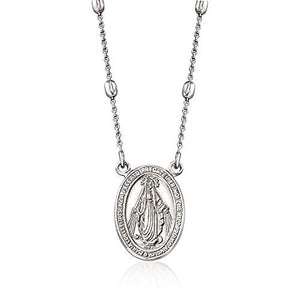 - PLATA DE LEY ITALIANA — Collar de cuentas de la estación "Medalla Milagrosa" en plata de ley italiana. Acabado pulido. La Medalla Milagrosa mide 3/4 pulg. de largo por 1/2 pulg. de ancho. Cuelga de una cadena tipo cable de 20 pulg. de largo por 1,1 mm con cuentas de estación ovaladas de 2,5 x 3,5 mm. 7,3 gramos. Cierre de langosta.