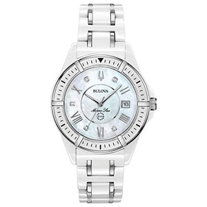 Reloj de cuarzo de cerámica blanca y acero inoxidable con tres manecillas y diamantes Marine Star de Bulova para mujer, con esfera de nácar blanco y cristal de zafiro. Estilo: 98P172