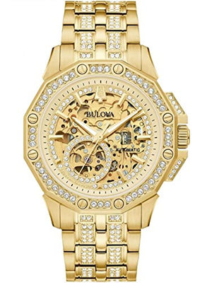 El reloj automático Bulova Octava de la colección Crystal, revestido en acero inoxidable en tono dorado, no es solo un reloj; es una declaración audaz de opulencia e innovación. Esta obra maestra combina el diseño exclusivo de Bulova con un toque de lujo, presentando un movimiento automático de 21 joyas con apertura abierta adornado con una deslumbrante variedad de 251 cristales en el bisel, la pulsera y la esfera.