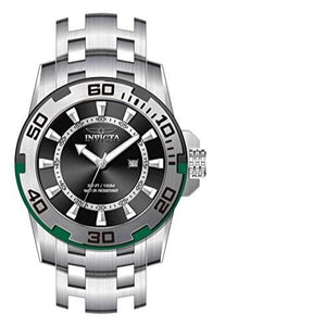 El reloj de cuarzo para hombre Invicta Pro Diver es un atractivo reloj con esfera negra y pulsera de acero inoxidable plateada.