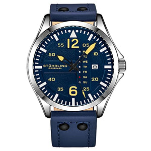 Reloj de cuero Stuhrling Original para hombre: reloj de aviación, fecha y día de ajuste rápido, correa de cuero con remaches de acero, colección de relojes para hombre (azul)