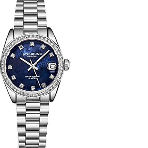 Características del reloj de vestir Stuhrling Original para mujer: pulsera de eslabones de acero inoxidable plateado, movimiento de cuarzo, esfera azul madreperla analógica con fecha: colección de relojes de diseño elegante e informal para mujer