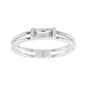 Este pequeño anillo de banda de plata esterlina presenta un delicado centro de piedra de circonita cúbica de corte baguette y una banda dividida.