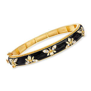 Nuestra encantadora pulsera tipo brazalete presenta abejorros zumbantes decorados con 1,40 ct. de topacio blanco en oro amarillo de 18 kt sobre plata esterlina sobre un fondo de esmalte negro llamativo. Una incorporación cautivadora para cualquier atuendo. Cierre de seguridad con doble cierre. Pulsera tipo brazalete con abejas de esmalte negro y topacio blanco con cierre de caja.
