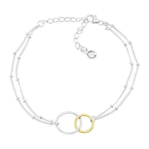 Los círculos entrelazados, uno de plata esterlina y el otro bañado en oro de 18 quilates, están ensartados a lo largo de una cadena de plata esterlina con cuentas de doble hebra para lograr un detalle ecléctico. La pulsera mide 7 1/2 pulgadas de largo, más un extensor de 2 pulgadas para una longitud ajustable, y cuenta con un cierre de langosta. La pieza viene con un sello de calidad de plata esterlina ".925" como símbolo de calidad garantizada del producto.
