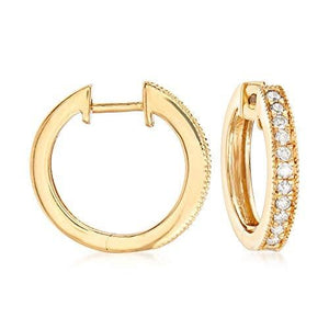 - DIAMANTES Y ORO DE 18 QUILATES SOBRE PLATA DE LEY — Aros de diamantes de 0,25 ct. con borde de cuentas en oro amarillo de 18 quilates sobre plata de ley. Diamantes redondos de talla brillante de 0,25 ct. Acabado pulido. Largo colgante de 1/2 pulg., ancho de 1/8 pulg. Cierres con bisagras.