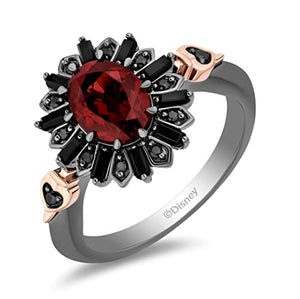 Anillo del trono de la Reina Malvada con rodio negro sobre plata esterlina y oro rosa de 10 quilates de 1/10 quilates en total, diamantes negros, ónix negro y granate rojo