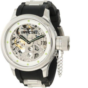 Caja de acero inoxidable con correa de caucho de poliuretano negro con insertos de barril en tono plateado. Bisel fijo de acero inoxidable. Esfera esqueletizada con manecillas negras luminosas y marcadores de hora de puntos. Tipo de esfera: analógica. Manecillas y marcadores luminiscentes. Subesfera de segundos pequeños en la posición de las 9 en punto. Movimiento de cuerda manual calibre Seagull 3600K con una reserva de marcha de 46 horas. Cristal Flame Fusion resistente a los arañazos. Corona de empujar / tirar con tapa protectora. Fondo de caja esqueletizado. Forma de caja redonda. Tamaño de la caja: 52 mm. Grosor de la caja: 18 mm. Ancho de banda: 26 mm. Longitud de la banda: 10 pulgadas. Cierre de espiga. Resistente al agua a 50 metros / 165 pies. Funciones: horas, minutos, segundos. Serie Quinotaur Russian Diver. Estilo de reloj casual. Reloj mecánico esqueletizado Invicta Russian Diver para hombre 1242. Color: Plata.
