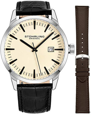 Montre-bracelet minimaliste à quartz suisse en acier inoxydable pour homme Stuhrling Original, réglage rapide de la date, 2 bracelets en cuir facilement interchangeables – Série 555AZ