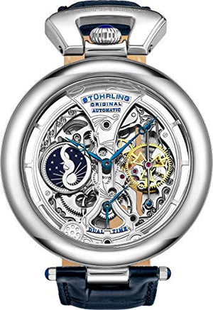 Montre automatique pour homme Stührling Original Skeleton avec bracelet en cuir de veau et double fuseau horaire, AM/PM Sun Moon, collection de montres pour homme 3919 (argent bleu)