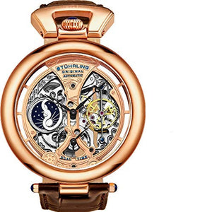 Caractéristiques de la montre automatique Stührling Original pour homme avec cadran squelette en or jaune et bracelet en cuir de veau - Double fuseau horaire, AM/PM Sun Moon, collection 3919 Montres pour hommes