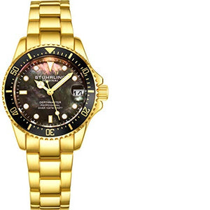 Caractéristiques de la montre de plongée pour femme Stuhrling avec bracelet en acier inoxydable, mouvement à quartz et date (or)