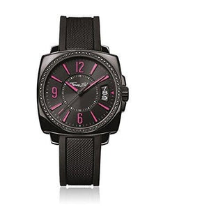 Boîtier/lunette : 40,5 mm, acier inoxydable noir à placage ionique, pierres de zircone synthétique noires (rondes, taille diamant) / cadran/aiguilles : cadran noir à rayons de soleil, aiguilles et index rose vif / fonctions : heure, minute, seconde, grand affichage de la date / bracelet/fermeture : bracelet en caoutchouc silicone noir, design « Clous de Paris », fermoir papillon en acier inoxydable noir à placage ionique / étanchéité : 10 ATM / mouvement : quartz/MIYOTA 2415.
