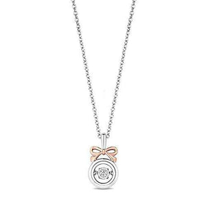 Cette création de bijoux fins Disney Enchanted présente un pendentif rond en argent sterling poli avec un accent de nœud en or rose et un diamant dansant de 1/20 ct au centre. Collier Disney Blanche-Neige en argent sterling 1/20 ct. Inspirée par la grâce et l'optimisme, la collection Blanche-Neige présente son nœud, un miroir magique et bien sûr, une pomme avec grenat et diamant. Couleur : Argent.