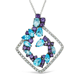 Ce superbe collier pendentif présente une forme en spirale composée de topazes bleues rondes, ovales, en forme de poire et de marquise et d'améthystes violettes, méticuleusement disposées à l'intérieur d'un cadre carré ouvert parsemé de topazes blanches étincelantes. La combinaison de topazes bleues vibrantes, d'améthystes violettes royales et de topazes blanches chatoyantes crée un affichage visuel à couper le souffle qui ne manquera pas de captiver tous les yeux dans la pièce. Laissez l'éclat de ces véritables pierres précieuses illuminer votre présence.