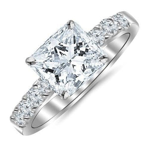 - Bague de fiançailles en or blanc 14 carats avec diamants taille princesse de 1,10 carat et sertis à griffes classiques, avec une pierre centrale de 0,55 cwt, couleur IJ et pureté Eye Clean. Les diamants latéraux des bagues de fiançailles sont de couleur GH et de pureté SI1-SI2.