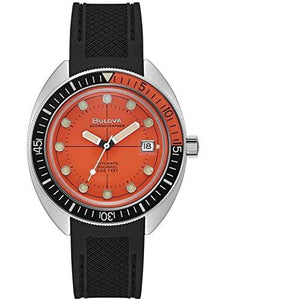 Orange dial enhanced by luminous silver-tone hands. Silver-tone stainless steel case with a black rubber band. Automatic movement. 200 meters / 660 feet water resistance. Fixed bezel. Scratch Resistant Sapphire crystal. Solid caseback. Tang clasp. Screw Down crown. Case size 41 mm x 14.55 mm. Band 19 mm x long. Bulova 96B350 Devil Diver Watch.