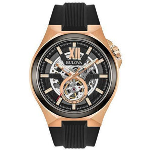Vouch for a fashionable and functional detail with this Bulova® Classic Automatic Mens Stainless Steel with Black Silicone Strap Maquina, Rose Gold-Tone (Model: 98A177)!