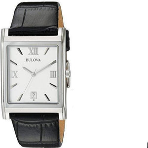 Stainless steel rectangular case with white dial on black leather buckle strap. Mineral crystal with date feature at 6 o'clock and roman numerals at 3, 6, 9 and 12 o'clock markers.