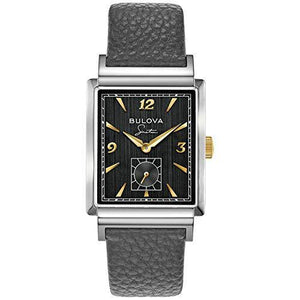Features a stainless steel rectangular case with a black dial, gold-tone hands and markers. Frank Sinatra’s signature is displayed under the Bulova logo and his iconic Fedora hat is etched on the gold-tone crown, as well as on the caseback along with the name, ‘My Way’. A distinct second hand sub sweep adds an elegant touch. The gray textured leather strap features a deployant buckle and is stamped with ‘My Way’ along the inside. Watch features a curved sapphire crystal and water resistance to 30 meters.