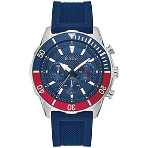 • Bulova Classic Chronograph Mens Watch features a blue dial with luminous hands and markers and a blue silicone strap.