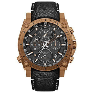 Powered by Bulova’s proprietary Precisionist eight-hand quartz chronograph movement with a 262kHz vibrational frequency—eight times greater than standard timepieces—for unparalleled accuracy. Distressed bronze IP case with black dial featuring bronze accents, curved mineral crystal, black leather strap with buffalo grain texture and contrast topstitching and three-piece buckle closure. 300-meter water resistance.