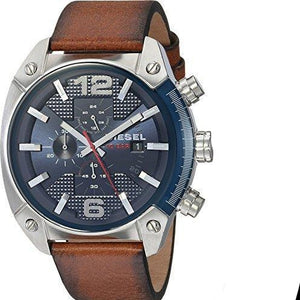 - The Diesel Overflow watch features a silver case and is complete with a brown leather strap.