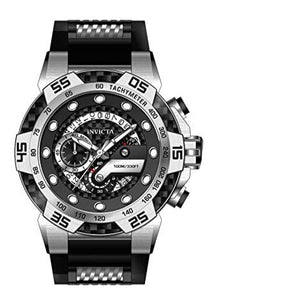 Black dial enhanced by silver-tone hands. Silver-tone stainless steel case with a black and silver-tone stainless steel and silicone band. Quartz movement. 100 meters / 330 feet water resistance. bezel. Flame Fusion crystal. Solid caseback. Buckle clasp. Pull / Push crown. Case size 51 mm x 16 mm. Band 30 mm x 8.25 incheslong. Invicta 36597 Speedway Watch.