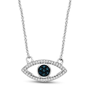 The Jewelili Sterling Silver Evil Eye Pendant Necklace is a beautiful rendition of the classic evil eye, combining traditional symbolism with modern elegance. Meticulously crafted with 1/10 Cttw treated blue and natural white round diamonds set in 925 sterling silver, this pendant is a stunning accessory that adds a touch of mystique to your style. The necklace comes with an 18-inch cable chain for a comfortable and versatile wear.