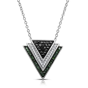 Jewelili Sterling Silver 1/6 Cttw Treated Black, Green and Natural White Round Diamond Triangle Pendant Necklace, 18" Rolo Chain