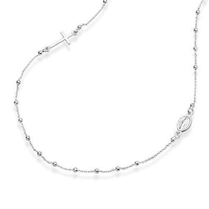Show your spiritual side with this 925 sterling silver rosary necklace featuring a Miraculous Medal of the Virgin Mary, a polished cross and small round beads. A modern twist on the classic rosary, this minimalist chain can be worn as a symbol of one’s faith or as a cool fashion statement. Just as beautiful with casual jeans as it is with a dressy outfit, wear alone for a dainty, everyday glam style or layered with other chains for a hip and trendy look. Use it as a religious symbol or as a fashion statement. Made in Italy.