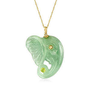 Here, a detailed elephant head is carved in a 28x36mm jade with a glowing .30 carat round peridot nestled within its trunk. Wear this majestic necklace to keep good luck on your side, and indulge in its earthy, peaceful aura. Suspends from a 14kt yellow gold Singapore chain, which adjusts from choker length to 22". Lobster clasp, peridot and jade elephant pendant necklace.