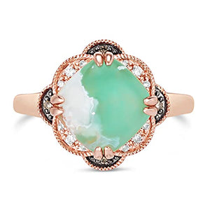 This glamorous handcrafted 14Kt rose gold plated 925 sterling silver ring by Le Vian features a cut and polished square cushion shaped aquaprase cabochon surrounded by quatrefoil flower petals filled with white topaz and brown smoky quartz gems. Each petal is edged in milgrain beading. This striking ring is sure to attract compliments at your next soiree or special event. Make the most of the Le Vian Grand Sample Sale and grab this cocktail ring now!